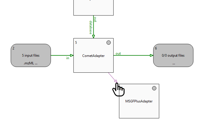 Another common example for a collector is upstream to a DecoyDatabase node, where you usually want to combine a species-specific database (e.g. human proteome), with a contaminant database (e.g. cRAP). The pipeline below thus combines two FASTA files, given in input node #1 by invoking DecoyDatabase once with a list of two files. DecoyDatabase's output is then recycled and fed into CometAdapter repeatedly (5 times to be exact, since there are 5 mzML files in input node #2).