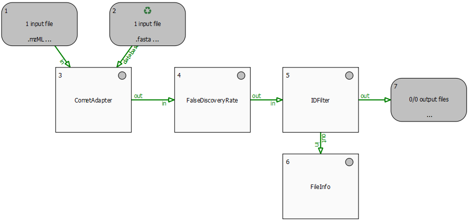 This section describes an example identification pipeline contained in the example directory, Ecoli_Identification.toppas. Inspect it in TOPPAS via File -> Open Example File. It is shipped together with a reduced example mzML file containing 139 MS2 spectra from an E. coli run on an Orbitrap instrument as well as an E. coli target-decoy database (which was created using DecoyDatabase).
