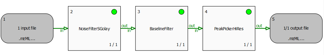 The file peakpicker_tutorial.toppas can be inspect it in TOPPAS via File -> Open Example File. It contains a simple pipeline representing a common use case: starting with profile data, the noise is eliminated and the baseline is subtracted. Then, PeakPickerHiRes is used to find all peaks in the noise-filtered and baseline-reduced profile data.