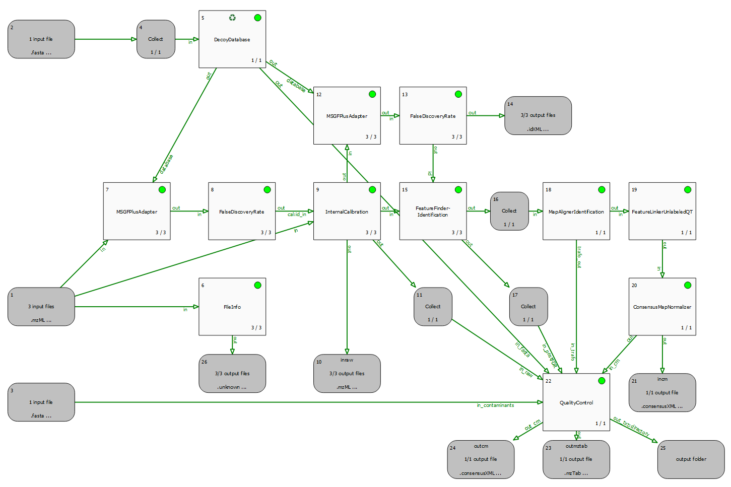 Most important is probably the output folder (node #25), which contains MaxQuant compatible output (evidence.txt and msms.txt). These .txt files can be used as input to external tools, such as PTX-QC to automatically obtain a comprehensive QC report.